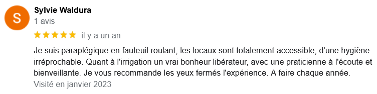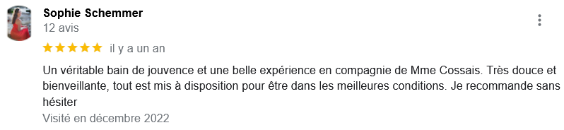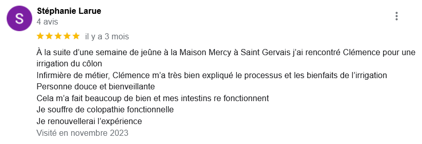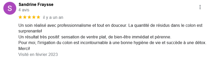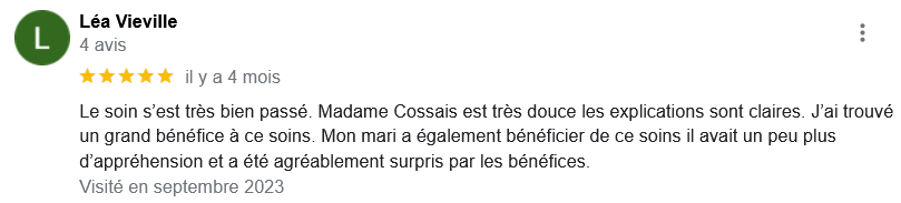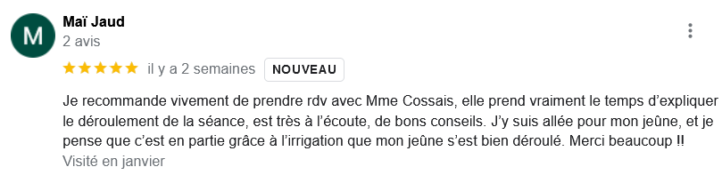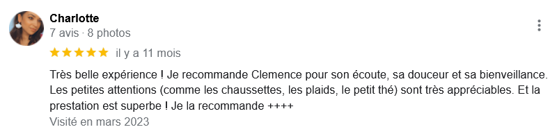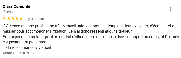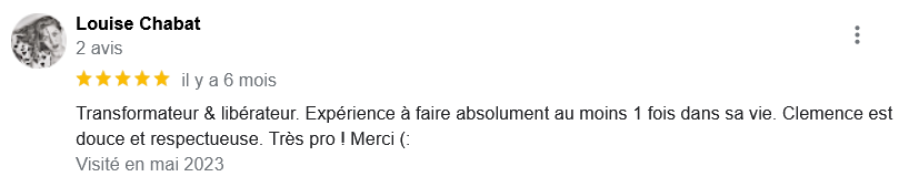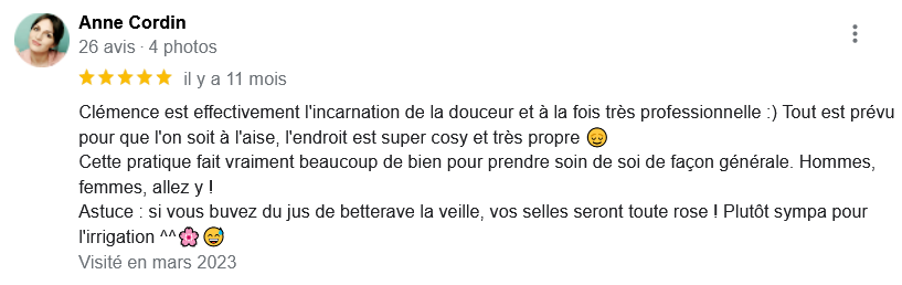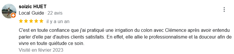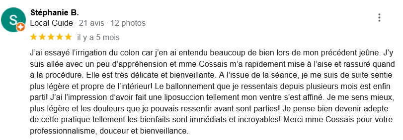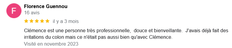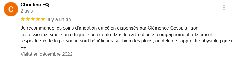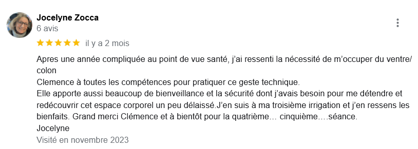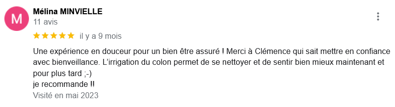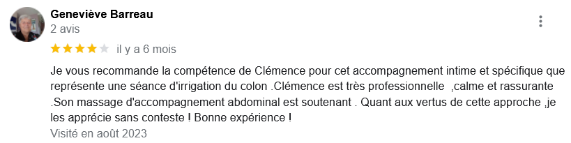EXCELLENT Basée sur 126 avis Publié sur Imene BeaucourtTrustindex vérifie que la source originale de l'avis est Google. Je recommande à 1000% Beaucoup de douceur, plein de bons conseils et de beaux résultats en 2 séances j’avais beaucoup de toxines ! Clémence est très professionnelle Foncez !!!Publié sur Jonathan LoiseauTrustindex vérifie que la source originale de l'avis est Google. Super expérience, une séance bénéfique je recommande à 100%. Clemence est extrêmement douce et met à l’aise.Publié sur Christine CORDESTrustindex vérifie que la source originale de l'avis est Google. Quelle délivrance et donc soulagement ☺️ grâce à Clémence...bienveillante et efficace. Je vous recommande Clémence et sa technique efficace. Personnellement, j'ai pris aussi après la séance, des compléments alimentaires pour tout remettre à neuf 😁 et repartir sur une bonne base saine. Merci beaucoup Clémence ☺️ Rdv dans quelques mois pour entretenir ce ventre qui est la base de notre santé 😉Publié sur Lionel AstieTrustindex vérifie que la source originale de l'avis est Google. Je recommande le travail de Clémence, l'accompagnement est parfait, sa disponibilité est totale.Publié sur Fa ATrustindex vérifie que la source originale de l'avis est Google. Je recommande Clémence Cossais qui procède de manière très douce et rassurante, respecte votre rythme et pudeur. Elle prend le temps avant et après la séance, d'expliquer et d'échanger. Son cabinet est agréable, très propre et bien agencé et équipé. Elle prévoit tout pour que l'on se sente bien. Je me suis sentie mieux immédiatement après la séance. J'en suis à ma deuxième et je pense désormais faire cela régulièrement.Publié sur Martine FerrandoTrustindex vérifie que la source originale de l'avis est Google. Ma première séance s'est bien passée Clémence est une personne douce et qui m'a mise en confiance Pendant la séance elle vous explique le déroulement Il me tarde la prochaine séance Je me sens bien, moins stressée après cette première séance merci Clémence et à bientôtPublié sur FATIMATrustindex vérifie que la source originale de l'avis est Google. Merci pour votre écoute, votre bienveillance et votre professionnalisme. Merci pour l'espace chaleureux et sécure créé à l'occasion du RDV. Je recommande +++Publié sur Sylvie LAMARQUETrustindex vérifie que la source originale de l'avis est Google. Clemence est une belle personne,tres agreable,et accueillante,explique parfaitement la technique pratiquee,tres douce dans ses gestes lors du soin,je la recommande cela fait un bien etre immense de prendre soin de son corps,allez y, n hesitez pas!C est le deuxieme soin que je fais et cela est tres benefique en soiPublié sur Catherine CoulonTrustindex vérifie que la source originale de l'avis est Google. Un grand merci à Clémence COSSAIS pour son approche exceptionnelle concernant l'irrigation du côlon. Sa délicatesse est très appréciable. Elle prends le temps de vous expliquer toutes les étapes, ce qui vous permet d'être à l'aise. Elle vous donne d'excellents conseils. Très bons résultats : sensation de légèreté et bien-être retrouvé. Je recommande vivement !Publié sur Yanick Babadjanian (Dj Badja)Trustindex vérifie que la source originale de l'avis est Google. La consultation s’est très bien passée, tout a été fait dans les règles. Je recommande.