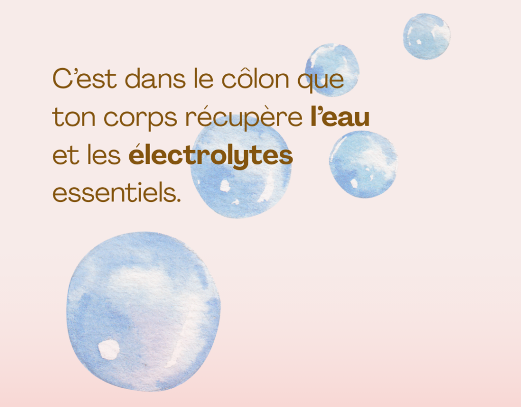 Au fur et à mesure que les déchets alimentaires se déplacent à travers le côlon, l’eau est continuellement absorbée (l’eau, c’est 2/3 de notre poids !). Les déchets s’assèchent alors et forment les matières fécales.