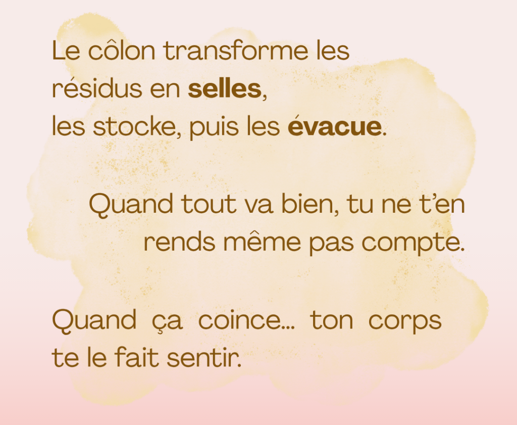 Une fois tout récupéré ce qui est intéressant pour l’organisme, le côlon transforme les résidus en selles qui sont stockées, et évacuées… si tout va bien 😉